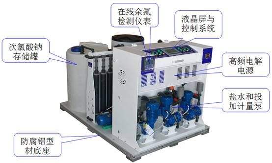整流电源、自动控制系统、存储与投加等部分组成,制成的纯净次氯酸钠溶液是